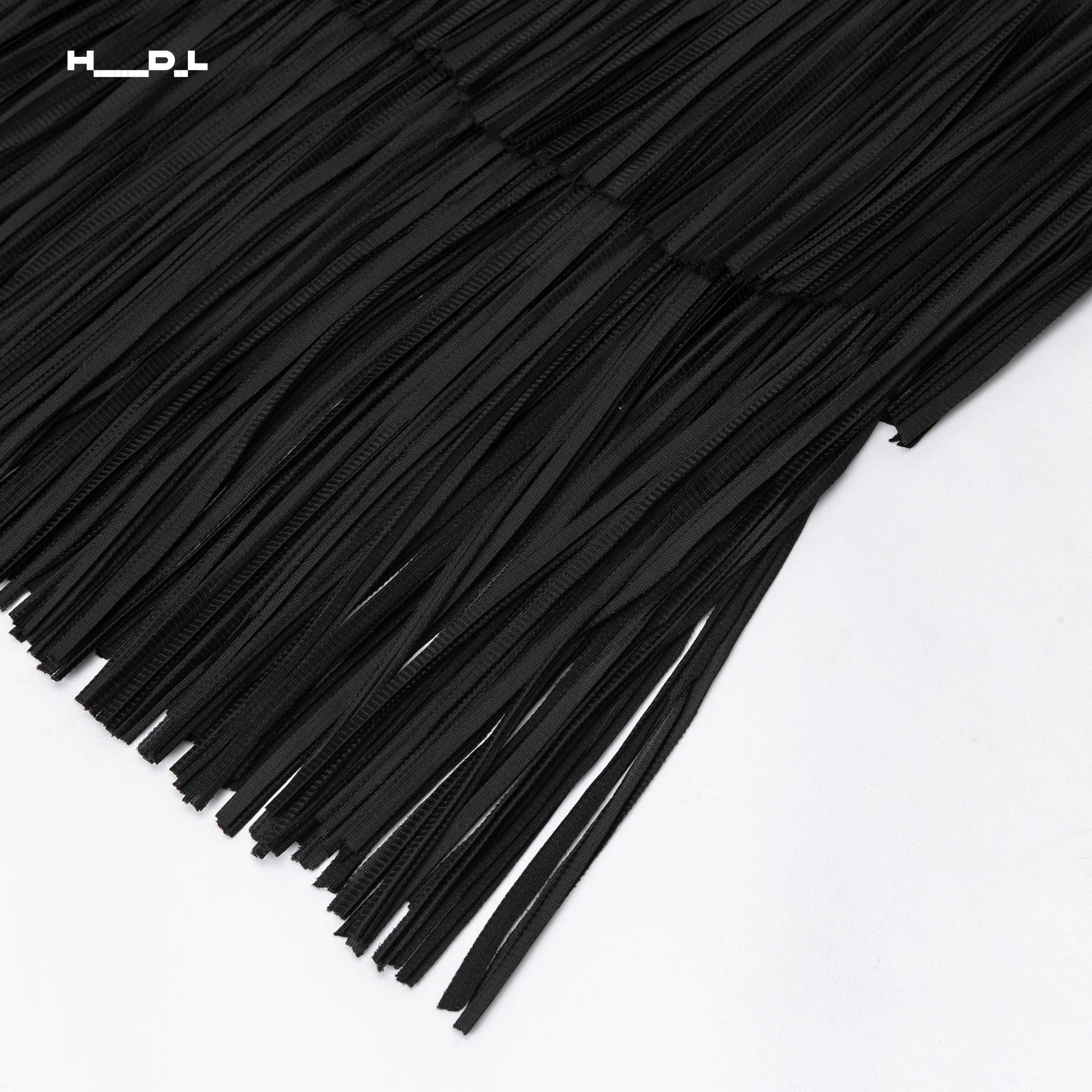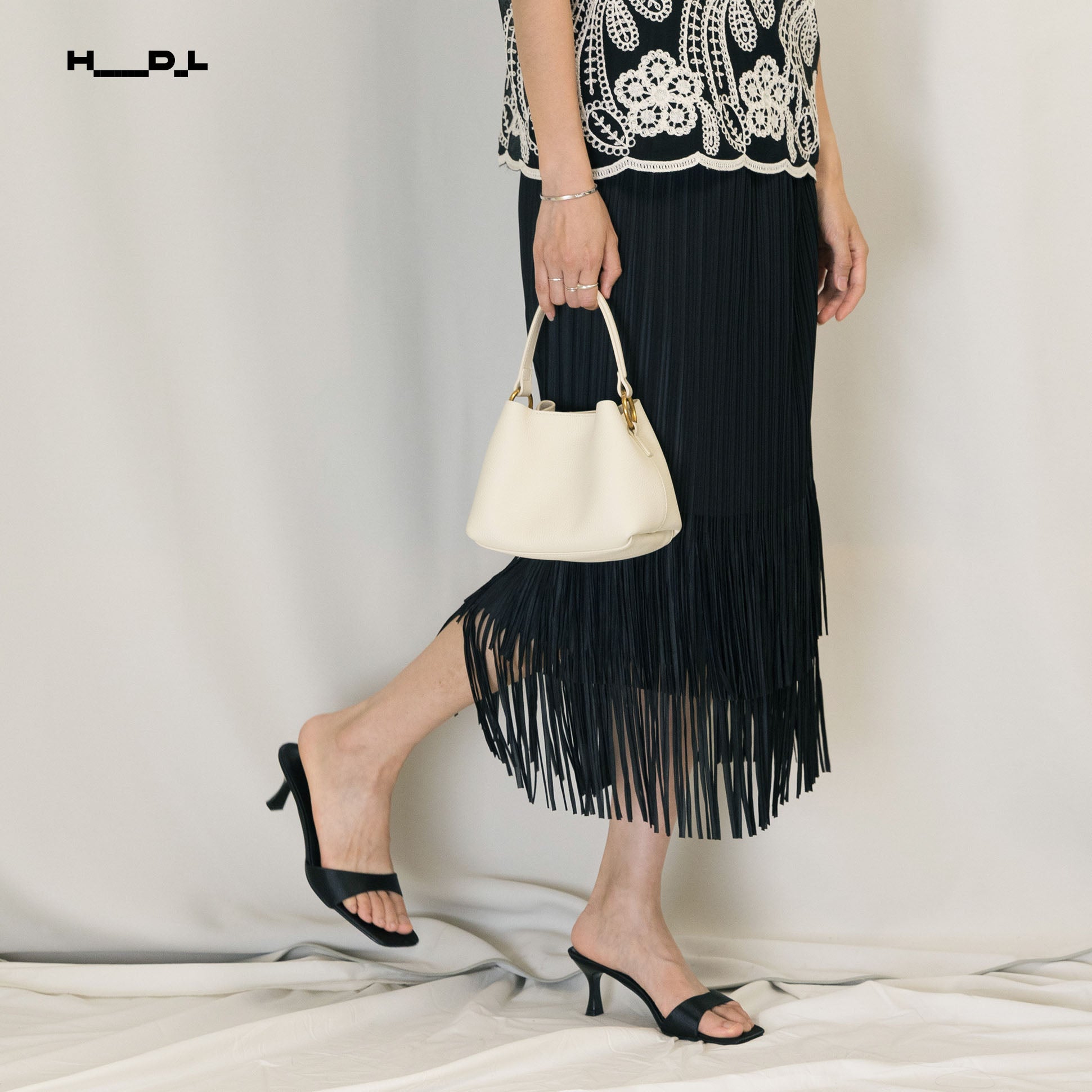 裾に向かって細やかなプリーツと流れるようなフリンジが広がる、動きのあるデザイン。